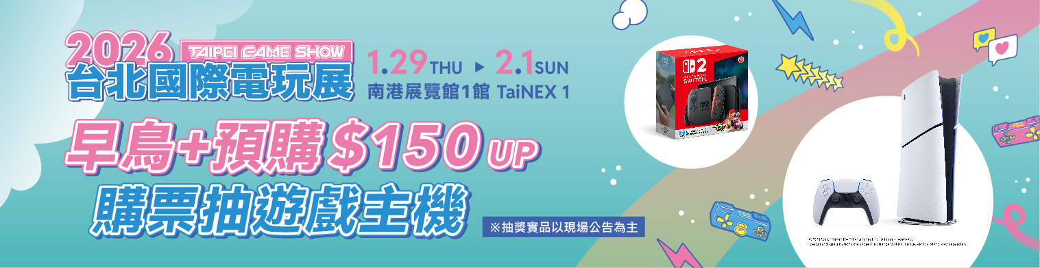 好評回歸!2026台北電玩展早鳥票限量開賣 購票現省百元、再抽熱門遊戲主機 「GAME STAR遊戲之星」就差你一票 周邊好禮等幸運兒帶回家! 每年開春最受矚目的遊戲盛會即將登場!2026台北國際電玩展(Taipei Game Show,TGS)將於1月29日至2
